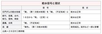 江宜樺行政院長が召集した水不足緊急対策チームは25日、石門ダム(桃園県)の給水地域(主に桃園県、新北市板橋区・新荘区)に出していた第1次給水制限を解除し、給水状況を示す信号を「第1次給水制限(黄)」から「不足気味(緑)」に変更すると発表した。一方、高雄地区では引き続き「第1次給水制限」を行い、6月末までに「第2次給水制限(橙)」にならないことを目標に管理していく方針だ。26日付工商時報が報じた。
