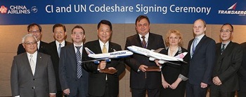 孫董事長(左5)とストヤノフ・トランスアエロ航空執行総監(右4)。孫董事長はロシア線について期待感を示し、今後は香港経由などでもトランスアエロ航空とコードシェアの可能性は十分あるとの見方を示した(中華航空リリースより)