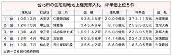 台北市立成功高級中学(台北市済南路一段)そばの住宅用地の地上権売却入札で25日、富邦人寿保険が権利金26億800万台湾元(約87億円)で落札した。権利金は住宅地の地上権売却では過去最高額で、1坪当たり単価は住宅地としては3位の238万9,500元。26日付工商時報が伝えた。