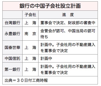 台湾銀行上海子会社の本部については、賃貸ではなく自社ビルとする方針で、現在物件を模索しており、来年、約10億人民元(約160億円)の予算を計上して取得を進める予定だ。