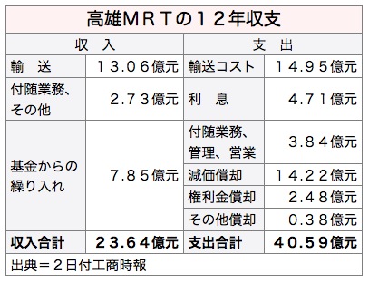 高雄都市交通システム(MRT)は2008年の開業以来、旅客輸送量が不十分で損益分岐点に達せず、減価償却費や支払い利息が重い負担となっており、このままでは3カ月以内にも債務超過となる恐れがある。高雄市政府は運行継続に向けて高雄捷運(KRTC)の負担を軽減すべく、BOT(建設、運営、譲渡)契約の変更で機電設備の受け取り時期を早めて、銀行融資の利息支払い2億台湾元(約7億円)余りを肩代わりすることを決めた。2日付工商時報が報じた。
