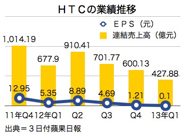 アナリストは、部品供給問題で新HTC Oneの出荷が遅れ、第1四半期の売上高が428億元(当初予想500億~600億元)にとどまったため、HTCは第2四半期見通しにも慎重になったと指摘した。