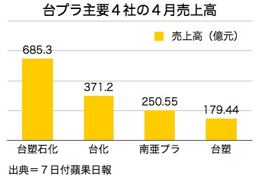 ほか3社の4月売上高は台湾化学繊維(フォルモサ・ケミカルズ&ファイバー)、371億2,000万元(前月比6.17%増)▽南亜塑膠工業(ナンヤ・プラスチックス)、250億5,500万元(同4.49%増)▽台湾塑膠工業(フォルモサ・プラスチックス)、179億4,400万元(同3.42%増)──だった。
