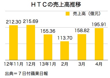 スマートフォン最大手、宏達国際電子(HTC)が6日発表した4月の連結売上高は195億9,100万台湾元(約660億円)で、前月比23.35%増、前年同月比36.87%減となり、証券会社の予測値220億〜250億元を大きく下回った。7日付工商時報などが報じた。
