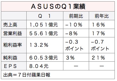 ASUSの第1四半期売上高は1,051億5,700万元で前期比10%減、前年同期比16%増。純利益は60億5,300万元で前期比3%増、前年同期比21%増と、ノートPC産業の需要不振にかかわらず高水準だった。