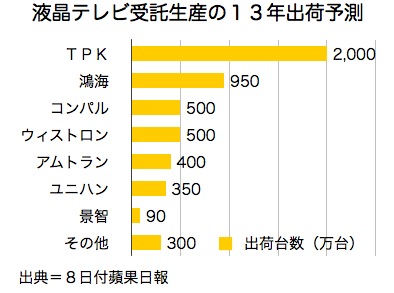 市場調査会社、ウィッツビュー・テクノロジーの調査によると、台湾の液晶テレビ受託生産メーカーの受注構成で、日本ブランドの割合が減る一方、中国ブランドは拡大していることが分かった。2011年以前に70~80%を占めた日本ブランドからの受注比率は今年33~34%まで低下する一方、中国ブランドの比率は9~10%に達する見通しだ。8日付工商時報が報じた。