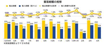 4月は輸入総額(227億7,000万米ドル)も、前月比5.2%減、前年同月比8.2%減のマイナス成長だった。半導体設備と鉱物製品の輸入が減少したためだ。半導体設備は4カ月連続で輸入が拡大していたが一服し、前年同月比5%減の29億4,200万米ドルだった。鉱物製品は66億1,600万米ドルと同14.9%減だった。減少額は11億6,000万米ドルと輸入全体の減少幅(20億3,000万米ドル)の6割を占めた。これについて財政部は台塑石化(フォルモサ・ペトロケミカル)の製油プラントが4月中旬から年次保守に入った影響が大きいと指摘した。