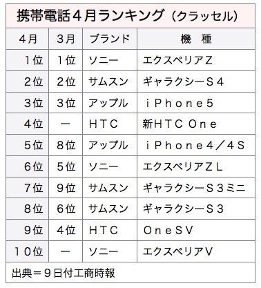 ランキングの首位はソニーの「エクスペリアZ」、2位は「ギャラクシーS4」、3位がアップルの「iPhone5」だった。競争激化の影響を受け、HTCのLTE対応入門機種「One SV」は9位(前月4位)に転落した。