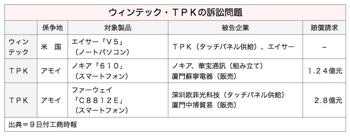 ウィンテックは、エイサーのノートパソコン「V5」に搭載されているTPKのタッチパネルが自社が米国で保有する特許権(特許番号8330738号)を侵害していると主張。今後、同製品の米国への輸入禁止を求めるか、和解を進めるかについてウィンテックは「現時点で具体的には決定していない」とコメントした。