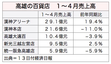 減収幅が最も大きかったのは、太平洋崇光百貨(太平洋そごう)高雄店で16%減、新光三越三多店も14.6%減と、三多商圏の不振が目立った。このほかは、▽漢神百貨本館、11.0%減(売上高21億6,000万元)▽統一阪急百貨高雄店、5.9%減(5億9,000万元)▽高雄大遠百、3.9%減(10億4,000万元)──などとなった。