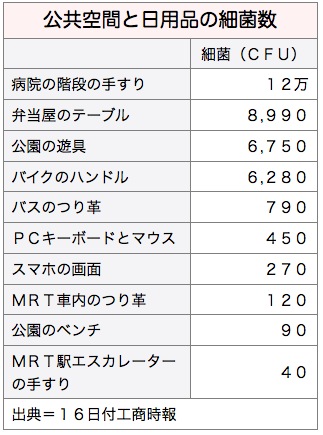 今回採用された調査方法は両手の指で触った際に付着した細菌の量を調べるというもので、菌量の単位「CFU(Colony Forming Units)」で表すと、病院の手すりは12万CFUで、これに▽弁当店のテーブル、8,990CFU▽公園の遊具、6,750CFU▽バイクのハンドル、6,280CFU▽バスのつり革、790CFU▽パソコンのキーボード・マウス、450CFU▽スマートフォンのディスプレイ、270CFU▽MRTのつり革、120CFU▽公園のベンチ、90CFU▽MRT駅エスカレーターの手すり、40CFU──と続いた。