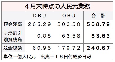 オフショア銀行部門(OBU)の4月末の残高は303億5,000万元で、DBUと合計した人民元預金残高は568億7,900万元となった。