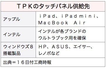 またTPKはヒューレット・パッカード(HP)、宏碁(エイサー)、華碩電脳(ASUS)、聯想集団(レノボ)にとっても、6〜7割のタッチパネルを供給する最大のサプライヤーとなっている。インテルが今後、タッチパネルをウルトラブック(超薄型軽量ノートPC)の標準装備として指定し、ブランド各社が第3四半期に相次いでタブレットPCやノートPCの新製品を投入すると見込まれる中、同期は深刻なタッチパネル供給不足が発生する見通しだ。