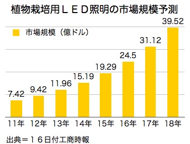 なお植物工場用LED照明の世界市場規模は今年、10億米ドルを突破して11億9,600万米ドルに拡大する見通しだ。今後5年間の年平均成長率は27%が予測されている。