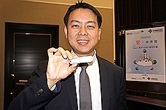 ドングルを持つ呉ASUSクラウド総経理。6月にも正式運用を開始したいと話した(16日=中央社)