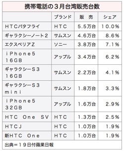 市場調査会社の統計によると、第1四半期はサムスン電子が「ギャラクシーS3」と「ギャラクシーノート2」合計で10万4,000台を出荷し、単価1万5,000台湾元(約5万1,000円)以上のハイエンドスマートフォン市場で首位を制した。ただ、HTCの「バタフライ」は月7万8,000台を販売して機種別では首位となった。