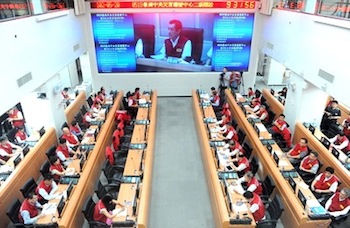 中央災害応変中心の様子。メディア関係者は4階から会議の様子を撮影していた(20日=中央社)