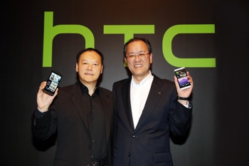 周HTC執行長(左)と田中孝司KDDI社長(右)。「HTC J One」による第2四半期売上高への貢献が期待される(HTCリリースより)