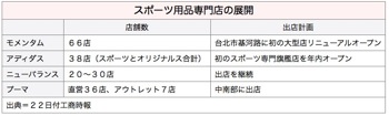 こうした中、商機拡大を受けて日本のエービーシー・マートが店舗数を増やしているほか、アディダスも年内にスポーツ用品専門店の第1号旗艦店オープンを予定している。観測によると、場所は台北市東区商圏の明曜百貨向かい側、現在ファッションブランド「エスプリ」が入居している店舗が有力となっている。