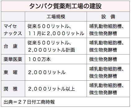 ほかにも潤泰集団(ルエンテックスグループ)の尹衍リョウ総裁(リョウは木へんに梁)と台湾浩鼎生技(オプティマー・バイオテクノロジー)の張念慈董事長が新竹生物医学園区(新竹県竹北市)に「P3レベル」のタンパク質新薬工場建設を計画。薬華医薬(ファーマ・エッセンティア)が中部科学工業園区(中科)に設置したタンパク質薬工場がcGMP(米食品医薬品局、FDAが規定する最新の製造管理および品質管理に関する基準)認証を取得している。