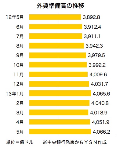 5月の外貨準備高は世界4位だった。上位3位は▽中国、3兆4,426億米ドル(3月末)、▽日本、1兆2,579億米ドル(4月末)、▽ロシア、4,731億米ドル(4月末)──だった。韓国は3,174億米ドルで6位。