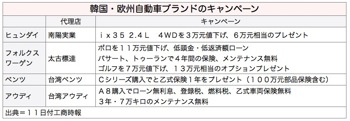 台湾政府による円安を背景とした値下げ要請に、日系自動車メーカーが価格引き下げや高額景品の贈呈などで応じる中、韓国、欧州ブランド車の販売が打撃を受けており、販売業者は韓国ウォンやユーロ相場に下落は見られないものの、同様の販売促進を打ち出さざるを得ない状況となっている。11日付工商時報が報じた。