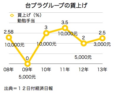 台塑集団(台湾プラスチックグループ)は11日の労使交渉で、今年7月の賃上げ率2.5%と勤勉手当1人当たり3,000台湾元(約9,500円)で妥結した。12日付経済日報が報じた。