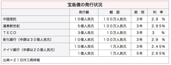 金融監督管理委員会(金管会)は20日、台湾でのオフショア人民元債券(通称・宝島債)の発行条件を大幅に緩和することを柱とする「国内債券市場発展促進プラン」を行政院に提出した。21日付工商時報が伝えた。