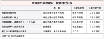 財政部が提示した公共建設事業のうち、特に注目を集めているのは、台湾鉄路(台鉄)の台北市・南港操車場の再開発、民間からの投資額・265億元▽台鉄・基隆駅と基隆港西第2・第3埠頭(ふとう)の再開発、同128億元▽新荘国際創新園区BOT(建設、運営、譲渡)計画、同92億元──の3件。