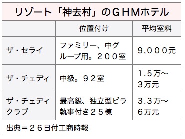今回神去村に導入されるホテルのうちGHM傘下で最高級ブランドのザ・チェディクラブは独立型のビラ25棟を設置し、それぞれパーソナルバトラー(執事)を配置する。宿泊費は3万3,000~6万台湾元(約11万~20万円)。