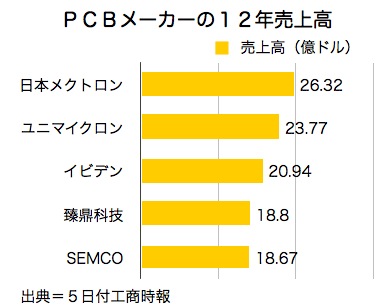 市場調査会社、プリズムアークによると、ユニマイクロンの12年売上高は23億7,700万米ドルで、前年の23億7,000万米ドルからほぼ横ばいだった。一方、首位に浮上した日本メクトロンは26億3,200万米ドルで前年比17.5%増だった。