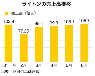 光電関連製品大手の光宝科技(ライトン・テクノロジー)は、6月の連結売上高が105億7,000万台湾元(約355億円)で前月比3%増、4カ月連続の増収となった。グループ全体の連結売上高は172億1,000万元で同4%増だった。カメラモジュール、電源装置の各部門が安定的に伸びたほか、タブレット型パソコン用キーボード、発光ダイオード(LED)の照明設備(車用を含む)の需要増などが増収を促した。9日付工商時報が報じた。