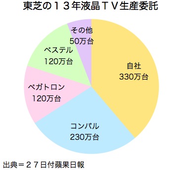 市場調査会社、ウィッツビュー・テクノロジーによると、東芝の今年のテレビ出荷台数は約850万台で、うち40%に当たる330万台は自社生産、残りの60%のうちコンパルが230万台、ペガトロンとトルコメーカーが各120万台、中国メーカーが50万台を生産するとみられる。