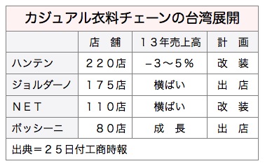 カジュアル衣料大手のユニクロが2010年10月に台湾に進出して3年以上が経過し、地方都市への出店攻勢を強める中、市場を奪われた台湾、香港の低価格カジュアル衣料ブランドがユニクロとの差別化を図り戦略変更を進めている。25日付工商時報が報じた。