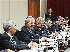 彭総裁(左2)は「牛肉麺など外食や豚肉、卵などの値上がりは認識している」と、消費者物価指数(CPI)だけでなく、実際の物価変動も今後の利上げの判断材料にすることを示唆した(27日=中央社)