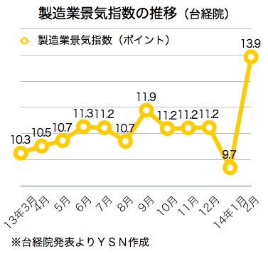 台湾経済研究院(台経院)が28日発表した2月の製造業景気指数は13.93ポイントで前月比4.24ポイント上昇し、景気信号は1月の青(後退)から緑(安定)に好転した。欧米景気が徐々に回復し、重要指標の「工業生産」と「輸出」が伸びたためだ。29日付蘋果日報が報じた。