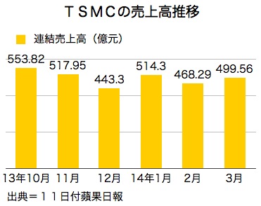 ファウンドリー最大手、台湾積体電路製造(TSMC)が10日発表した第1四半期連結売上高は1,482億1,500万台湾元(約5,000億円)で前期比1.7%増、前年同期比11.7%増となり、同社が上方修正した1,470億元の目標をも上回った。3月連結売上高は499億5,600万元で前月比6.7%増、前年同月比13.2%増だった。11日付工商時報が報じた。