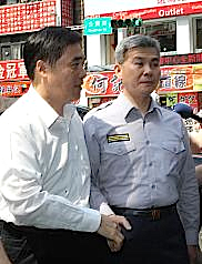 郝市長(左)は方局長(右)の手を握って対応は正当だったと励ました(12日=中央社)
