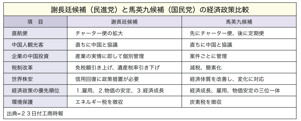 3月22日の総統選挙まで残り2カ月を切った。23日付経済日報、工商時報の両経済紙は、民進党と国民党の総統候補、謝長廷氏と馬英九氏にインタビューを行い、当選後の経済政策についての政見をまとめた。両候補とも中国人観光客の開放、減税の実施を掲げるなど、大枠で政策は似通っているが、謝候補は「主体性プラス開放性」を主張する一方、馬候補は「対中経済開放」を台湾経済の回復策の前提条件としており、根本的な部分では対中姿勢の違いが浮き彫りとなっている。