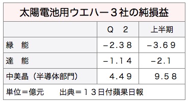 大同(Tatung)傘下、太陽電池用シリコンウエハー最大手の緑能科技(グリーン・エナジー・テクノロジー)の12日発表によると、同社第2四半期の純損失は2億3,800万台湾元(約8億円)に拡大、上半期通期では3億6,900万元に上った。第2四半期の製品価格下落が響いた。13日付蘋果日報が報じた。