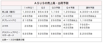 パソコン大手、華碩電脳(ASUS)は12日の業績説明会で、第3四半期のスマートフォン出荷は260万台と、前期の2.6倍となる見通しを示した。沈振来執行長は、超低価格機種「ZenFone」販売台数が8月に100万台に迫り、9月には100万台を超えると見込む。13日付経済日報などが報じた。