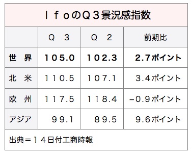 Ifo景況感指数はアジアが99.1と前期比9.6ポイント上昇し、最も伸びた。北米は110.5で3.4ポイントの小幅な上昇。欧州は117.5と0.9ポイント下落した。