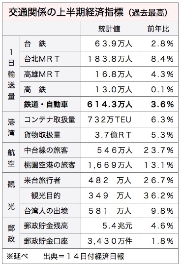 交通部が13日発表した上半期の交通統計は、訪台旅客数が前年同期比26.7%増の延べ482万人に達するなど、17項目中14項目で過去最高を記録した。特に観光、空運、海運で好調さが目立った。14日付経済日報が報じた。