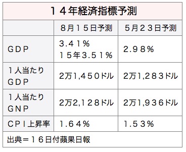行政院主計総処は15日、今年の域内総生産(GDP)成長率予測値を3.41%と、5月時点の予測2.98%から0.43ポイント上方修正した。3%台は3年ぶりとなる。上半期のGDPが従来予測を上回った上、下半期にアップルのスマートフォン次世代機種「iPhone6」発売やパソコン買い替えで、半導体など関連部品の商機が見込めるためだ。16日付経済日報などが報じた。