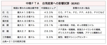 杜経済部長は、韓国にいったん市場を奪われれば、取り戻すのが非常に困難だとして、中韓FTAより大幅に遅れることに危機感を示した。一方、立法院で円滑に承認されるよう、中韓FTAより有利な条件を引き出すと強調した。