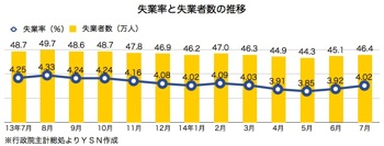 7月の失業者数は46万4,000人で前月比1万3,000人増えた。卒業生など初めて就職活動をする失業者が9,000人増加、自己都合退職の失業者が3,000人増加、臨時雇用の期間終了による失業者が2,000人増加した。一方で就業者数は2万9,000人増加し、1,109万1,000人だった。