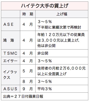 華碩電脳(ASUS)が9月5日支給分から平均3%の賃上げを行うことが分かった。上げ幅は昨年の2〜3%を上回った。従業員6,000人が対象。27日付蘋果日報が報じた。