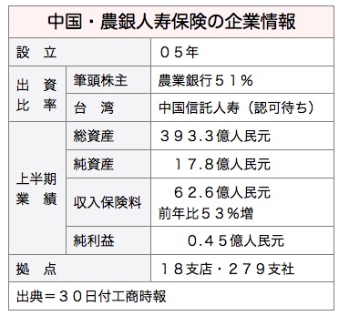 中国の5大国営銀行傘下の生保はこれまで、外資系保険会社からの出資受け入れを進めていたが、農銀人寿の提携先だけが決まっていなかった。農銀人寿は嘉禾人寿保険を前身とし、2012年12月に農業銀から51%の出資を受け、社名を農銀人寿に変更した。昨年の総収入保険料は中国生保業界で16位だった。
