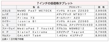 華碩電脳(ASUS)が28日に発表した7インチ・タブレット端末の新機種「MeMO Pad 7(ミーモパッドセブン)・ME70CX」がきょう(1日)発売された。価格はASUSがタブレット市場に参入して以来最低となる2,990台湾元(約1万円)だ。ASUSはミーモパッド製品で強力な低価格戦略を進めており、ライバルブランドに深刻な値下げ圧力をもたらしている他、世界的にタブレット端末需要が伸び悩む中、価格面での優勢を失ったホワイトボックス(白牌。無名、ノーブランド)は生き残りが困難となり、来年上半期から撤退が相次ぐとの見方が業界で出ている。1日付電子時報が報じた。