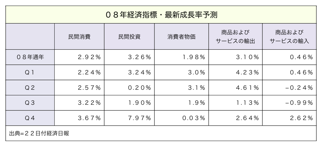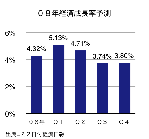 行政院主計処は21日、国民所得評審会議を招集し、今年の経済成長率予測値を、サブプライムローン(信用度の低い借り手向け住宅ローン)問題の影響、原油価格と農工業における原料価格の上昇などにより、これまでの4.53%から、過去3年間で最低の4.32%へと0.19ポイント引き下げた。一方、経済成長を左右する年平均インフレ率予測は、過去3年間で最高の1.98%へと引き上げた。なお、昨年第4四半期は予想を大きく上回る6.39%の成長を記録し、台湾経済の堅調を印象付けた。22日付工商時報などが報じた。